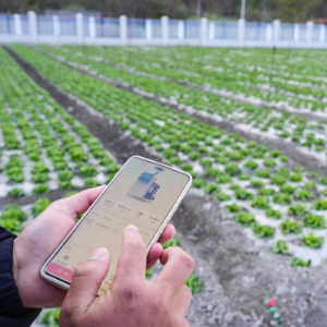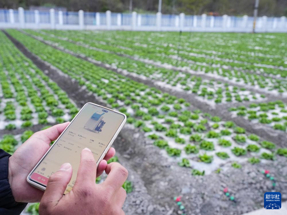 4月17日,技术人员用手机操作智能水肥一体化系统为培育的生菜浇水施肥。