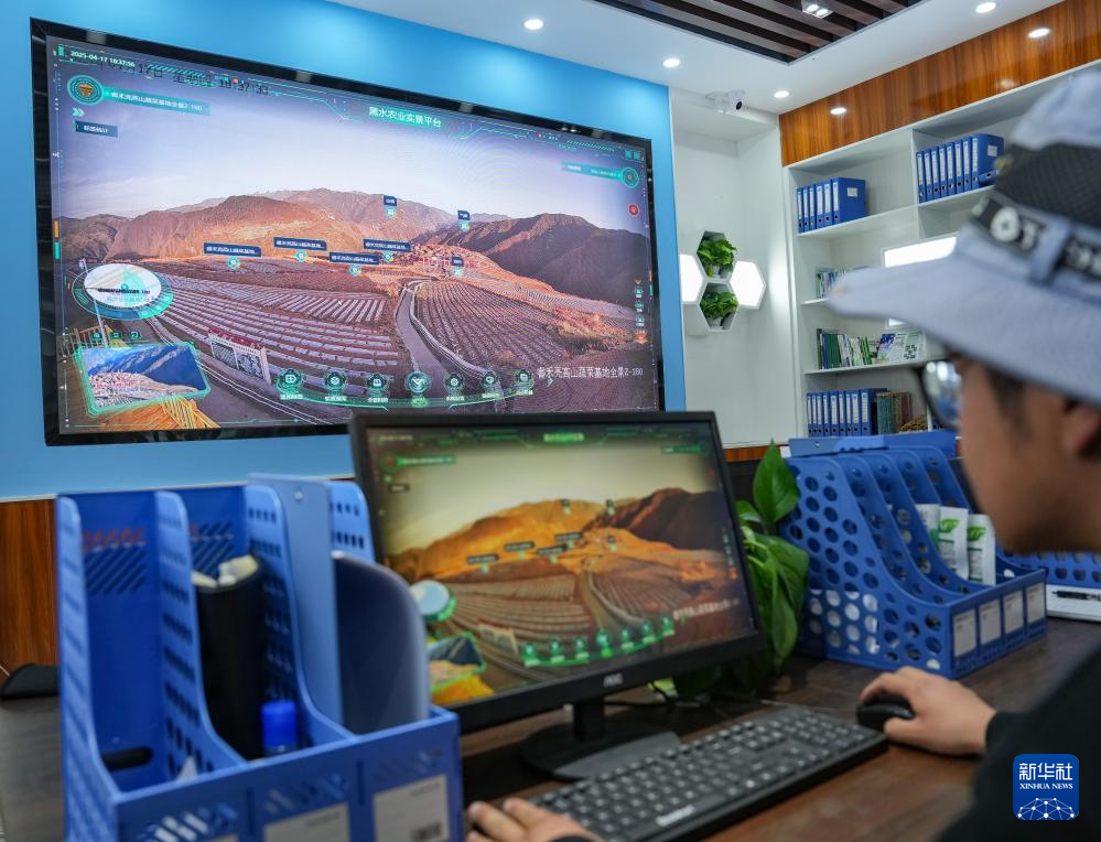 4月17日,技术人员在操作智慧农业监测系统查看农情。