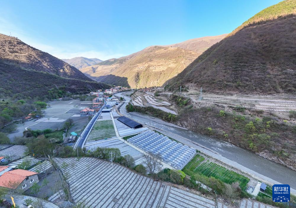 这是4月17日在四川省阿坝藏族羌族自治州黑水县晴朗乡拍摄的小麦蔬菜现代农业园区新品种选育及中试熟化试验基地(无人机照片)。