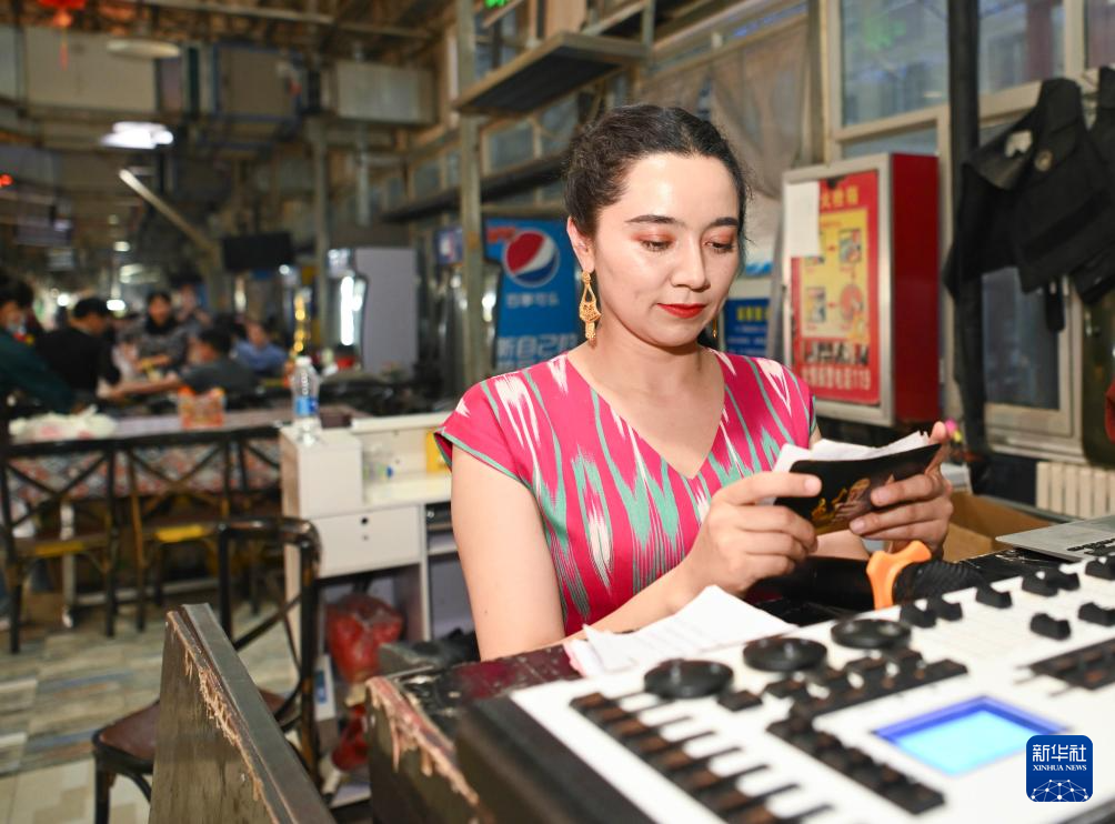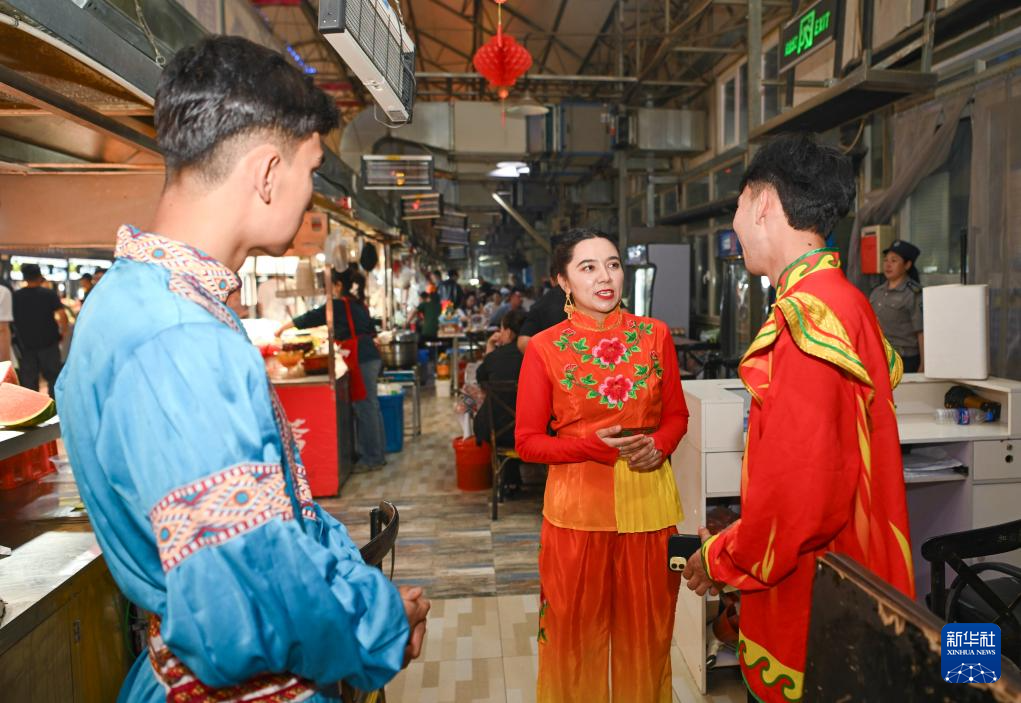 34岁的努尔比耶·居热艾提和10多名同事一起承担演出任务,他们用歌舞的形式,为游客展现了新疆丰富多彩的文化艺术,表达对和田发展变化的礼赞。