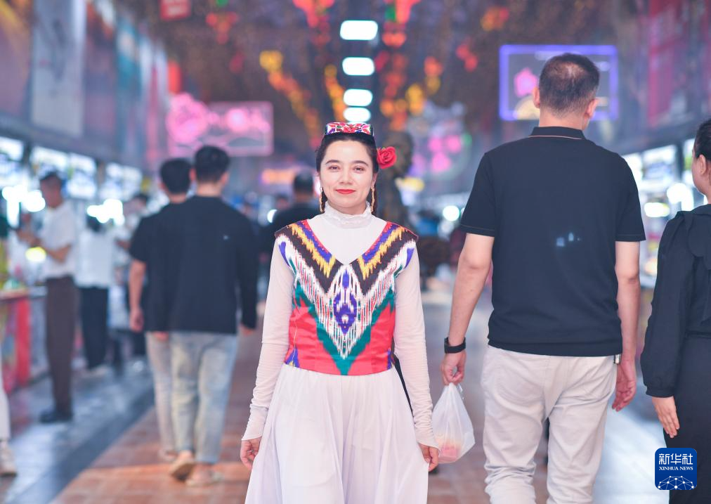 努尔比耶·居热艾提走在新疆和田夜市上(4月16日摄)。