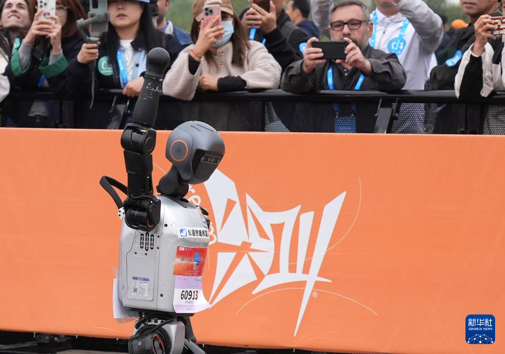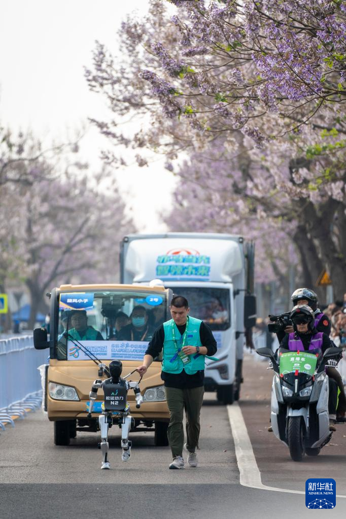 4月19日,小顽童队选手松延动力N2在比赛中冲向终点。