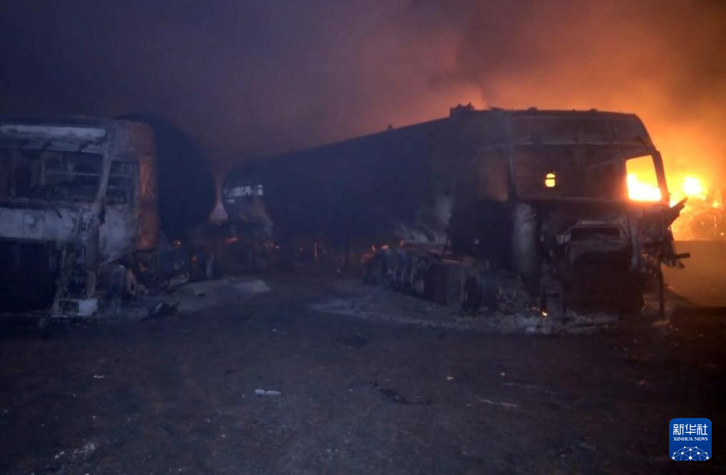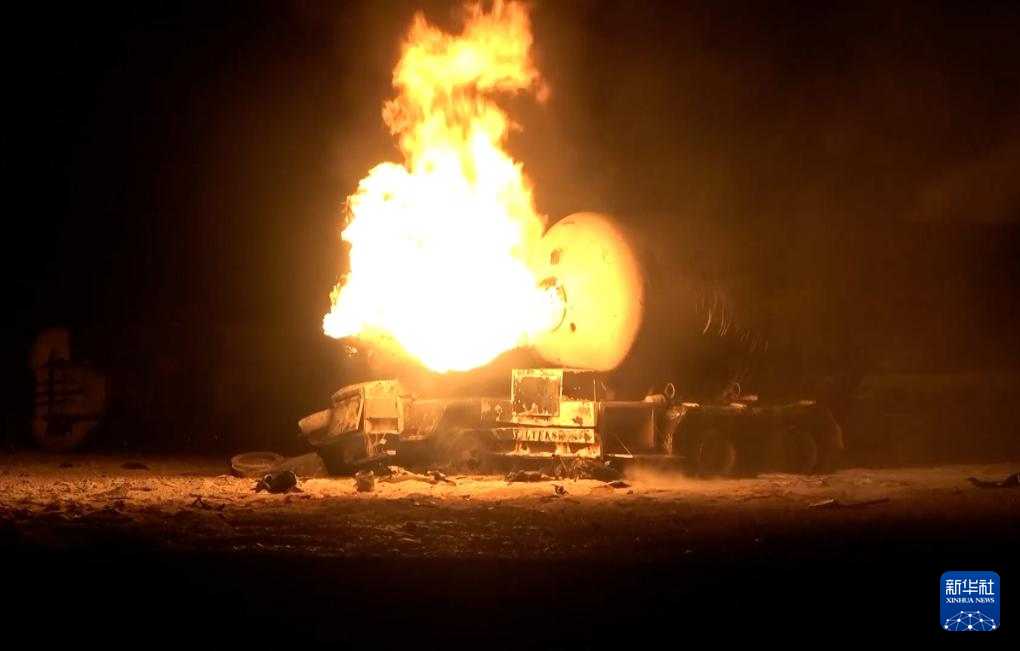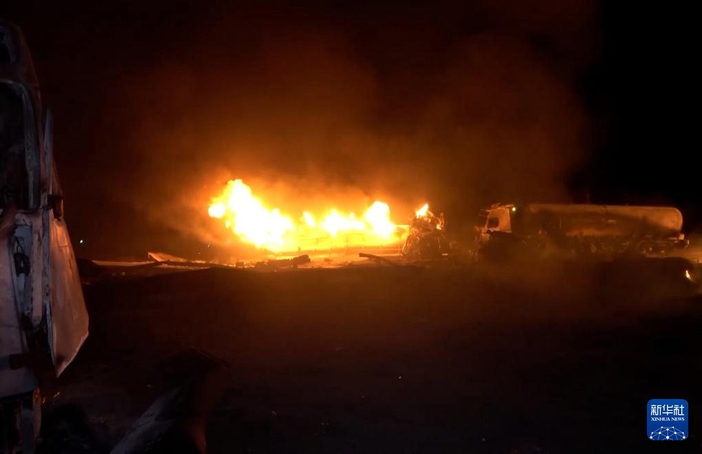4月17日,在也门荷台达省伊萨角港,遭美军空袭的车辆燃起大火(视频截图)。