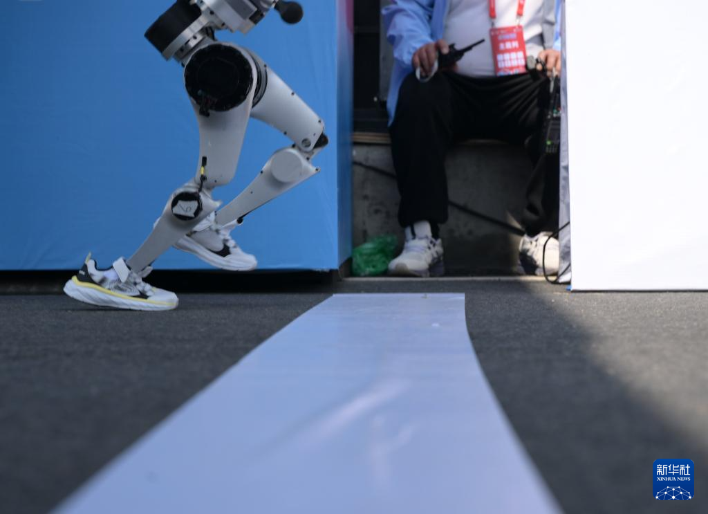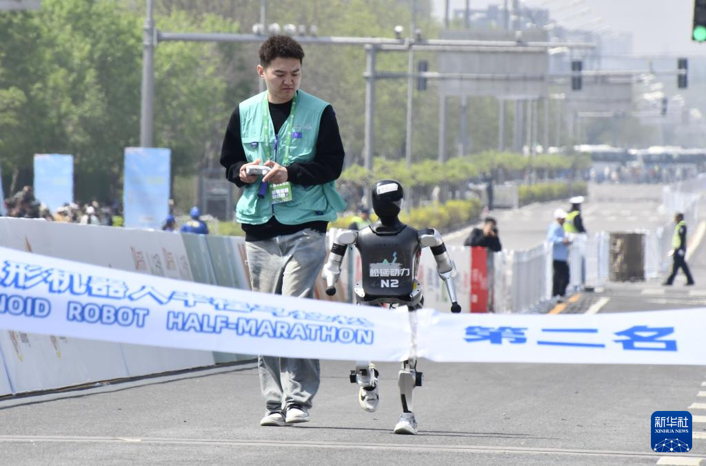 4月19日,小顽童队选手松延动力N2在比赛中冲向终点。