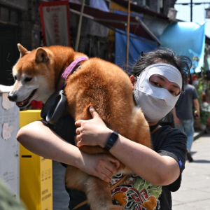 4月20日是二十四节气的谷雨,重庆市最高气温达到34摄氏度。在荣昌区万灵古镇,主人担心路面太烫,抱着宠物犬在街面行走。