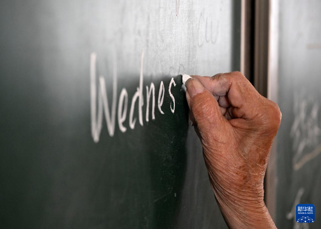 4月8日,在卜陈村“留守未成年人之家”,叶连平写板书时用手紧抓黑板,以支撑身体。