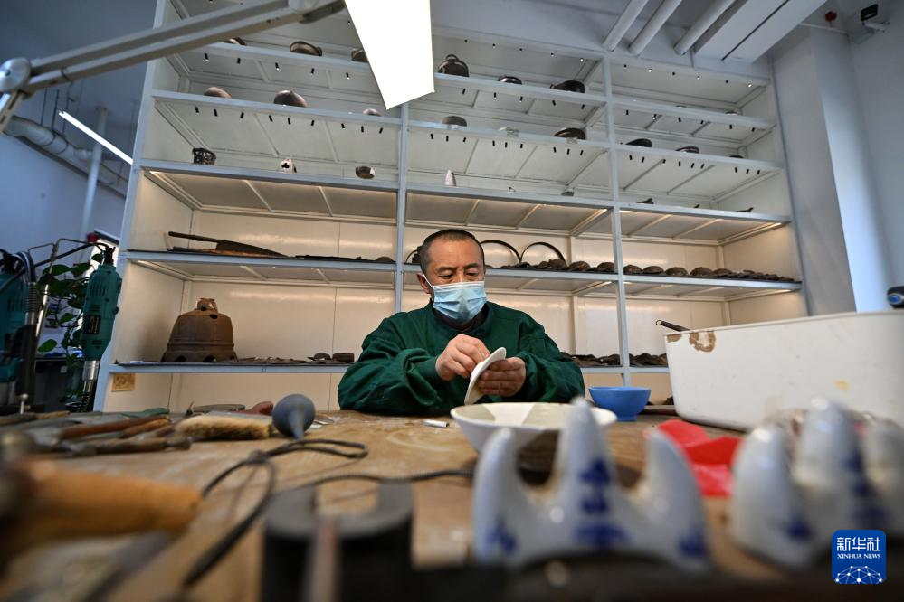 4月15日,在云冈研究院可移动文物修复室,工作人员李鹏飞在进行瓷器修复。