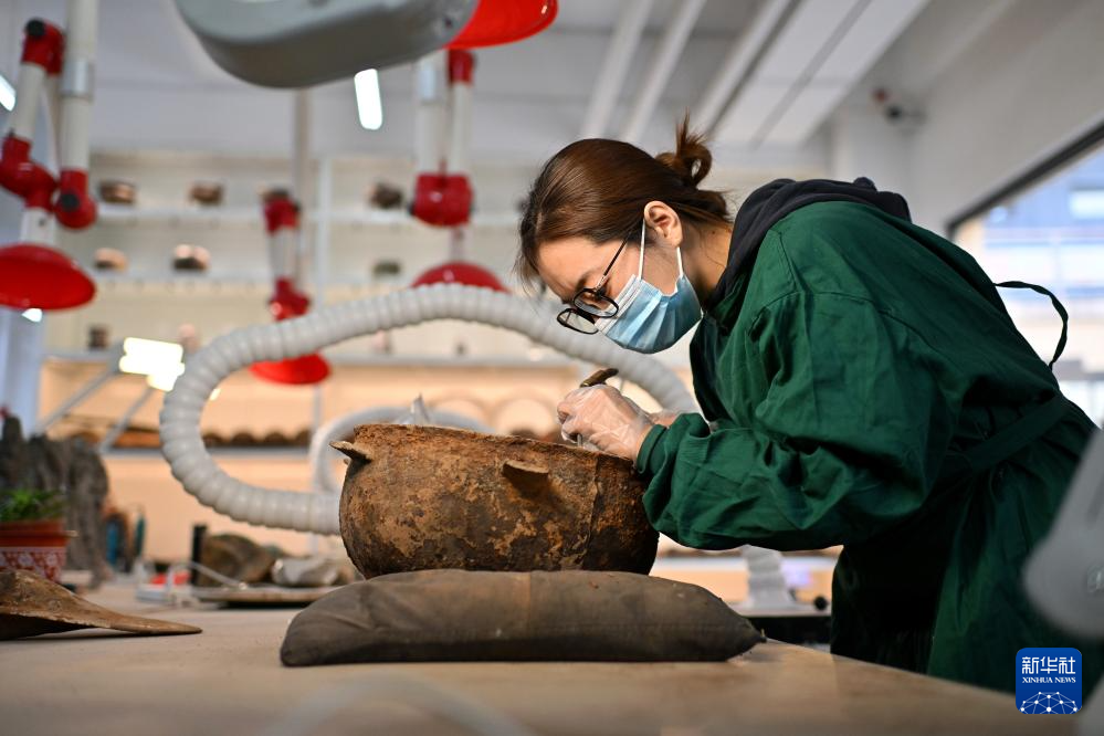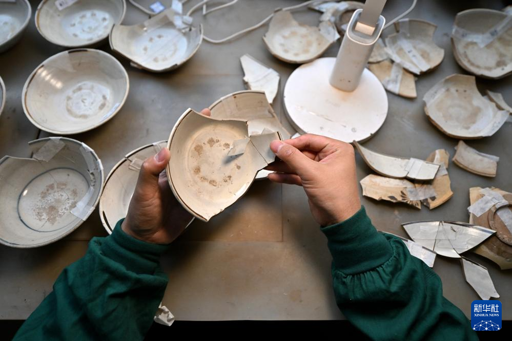 4月15日,在云冈研究院可移动文物修复室,工作人员在进行瓷器修复。
