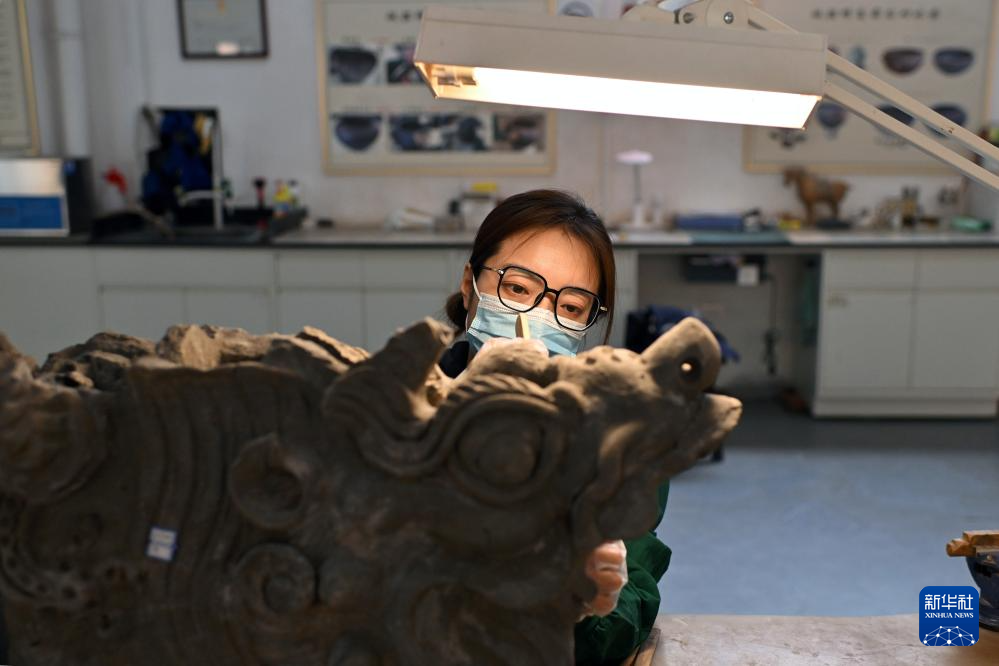 4月15日,在云冈研究院可移动文物修复室,工作人员在进行除尘作业。