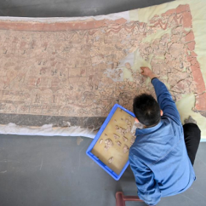 4月15日,在云冈研究院壁画文物修复室,工作人员戴宇翔在修复壁画。