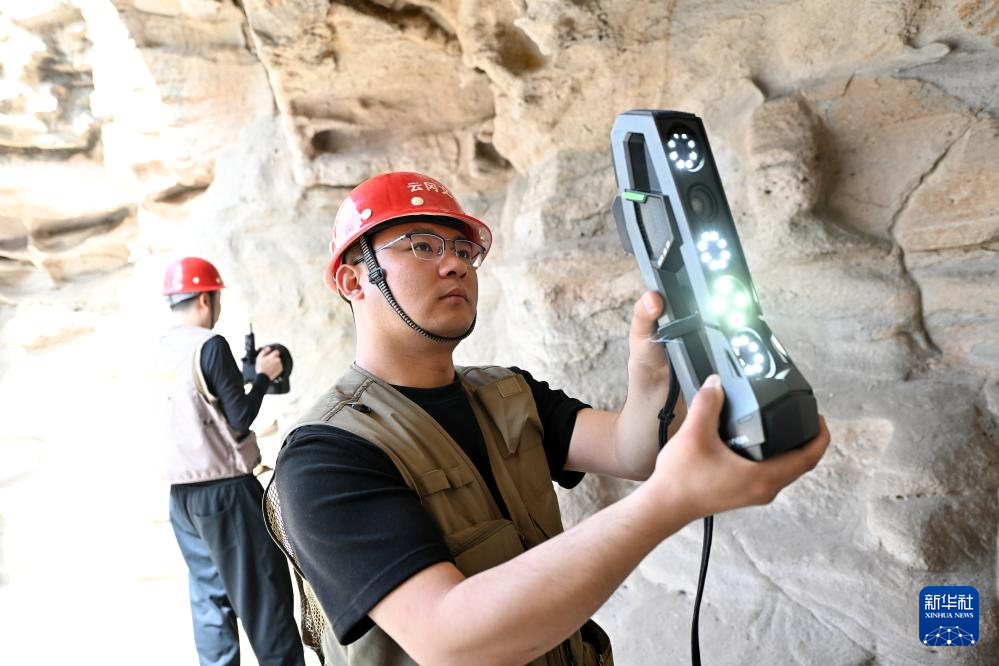 4月16日,云冈研究院数字化保护中心工作人员王超(左)在云冈石窟进行数字化信息采集。