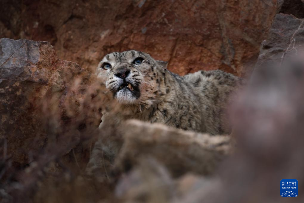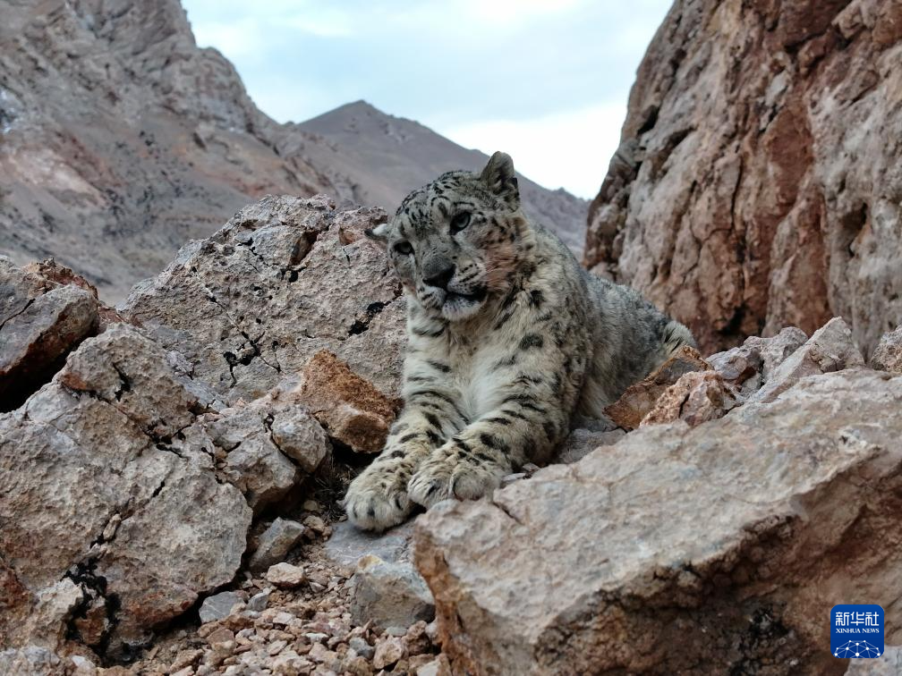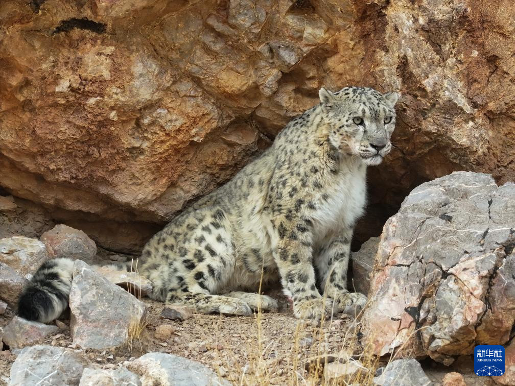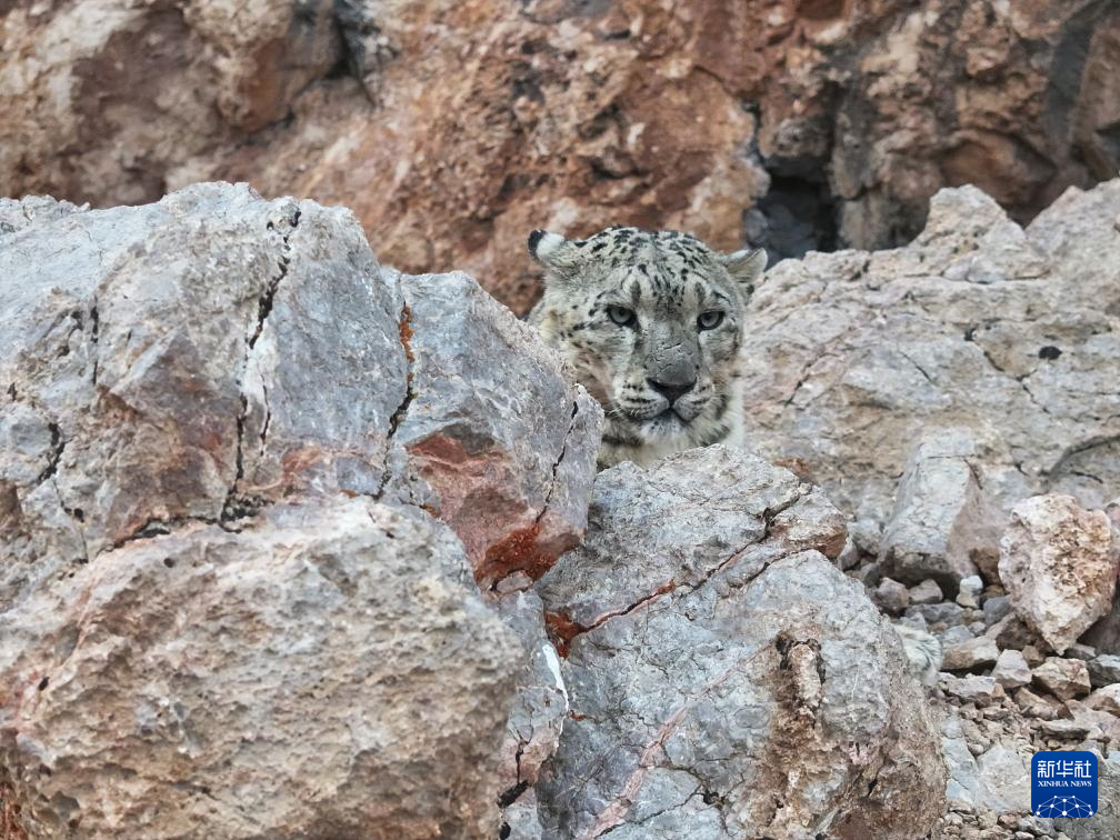 西藏阿里改则县改则镇玉多村附近岩山区域拍摄到的国家一级保护动物雪豹(4月18日摄)。