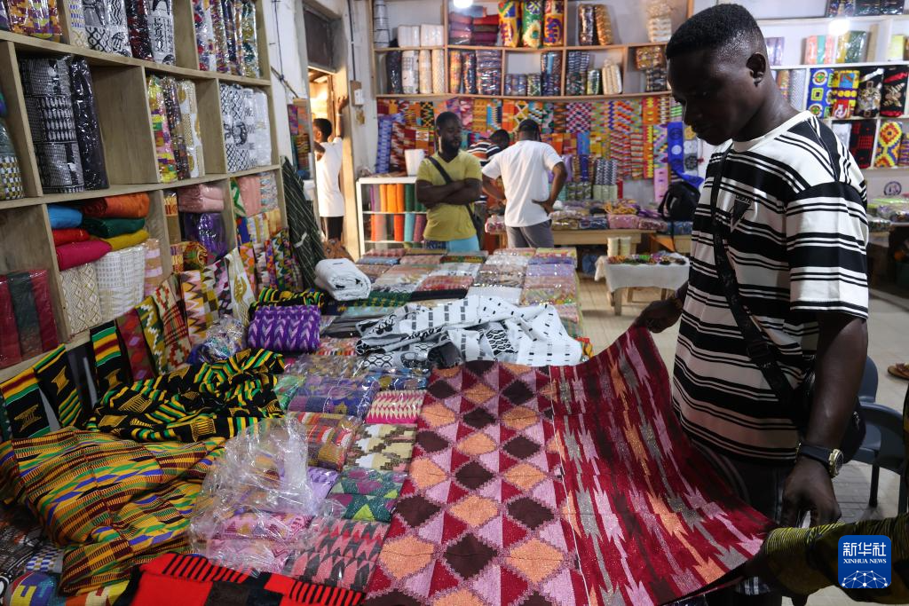 3月13日,在加纳阿散蒂省库马西市,商家在商店内整理“肯特布”。