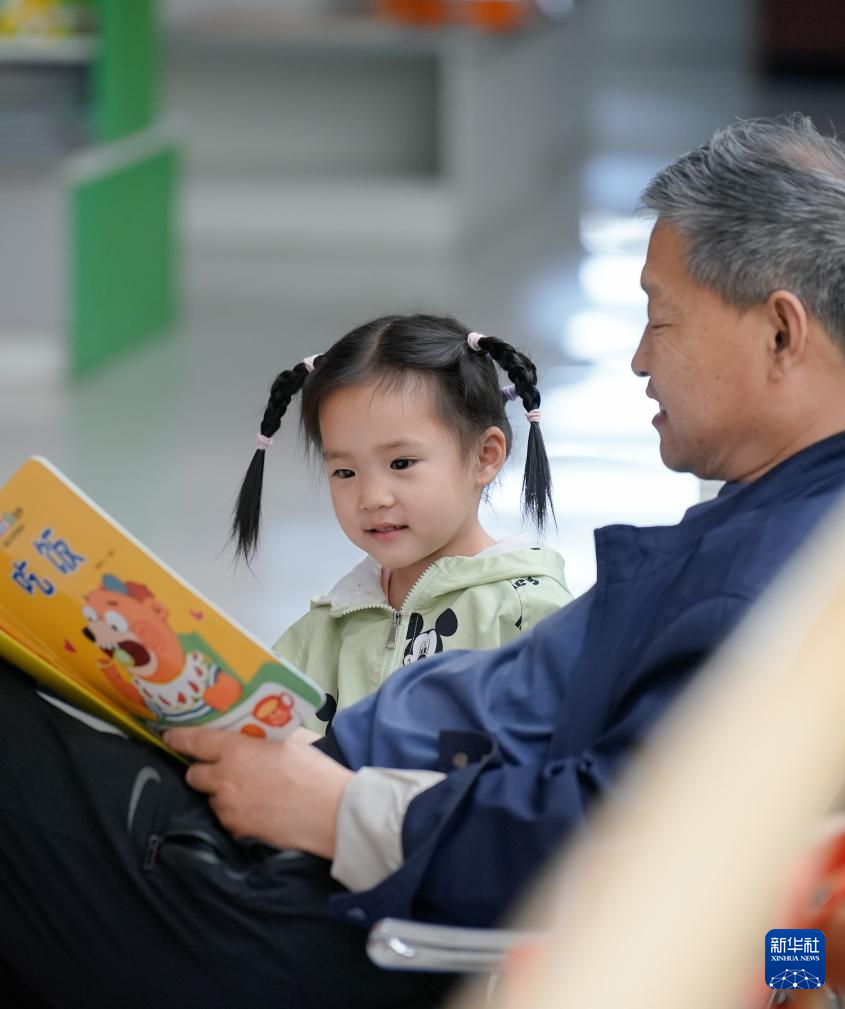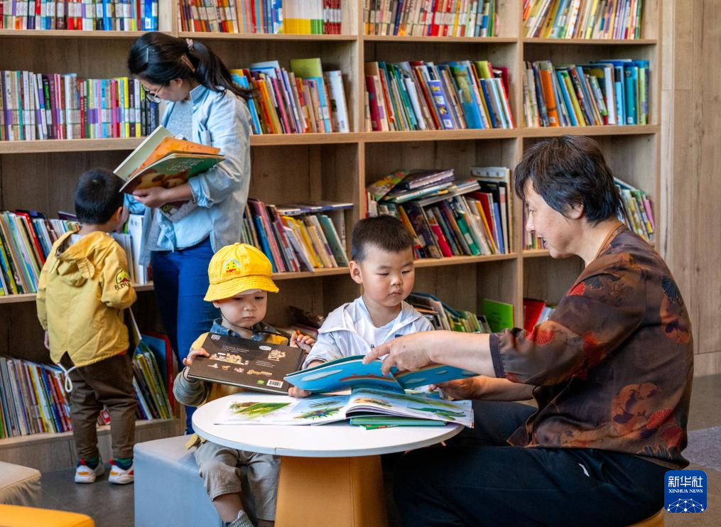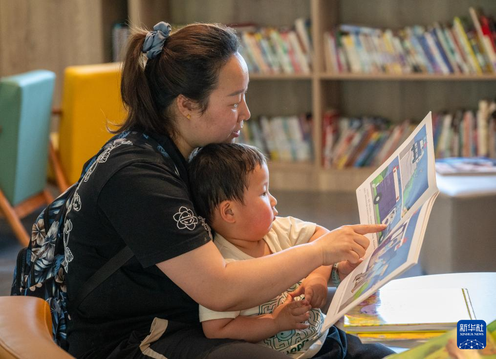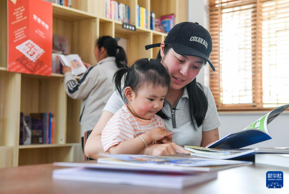 4月23日,在河北省石家庄市平山县北庄村农家书屋,家长带着小朋友一起阅读。