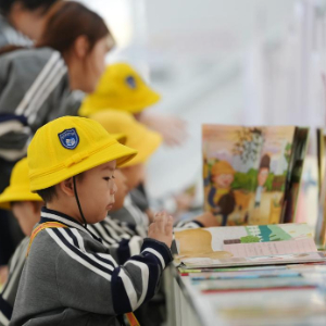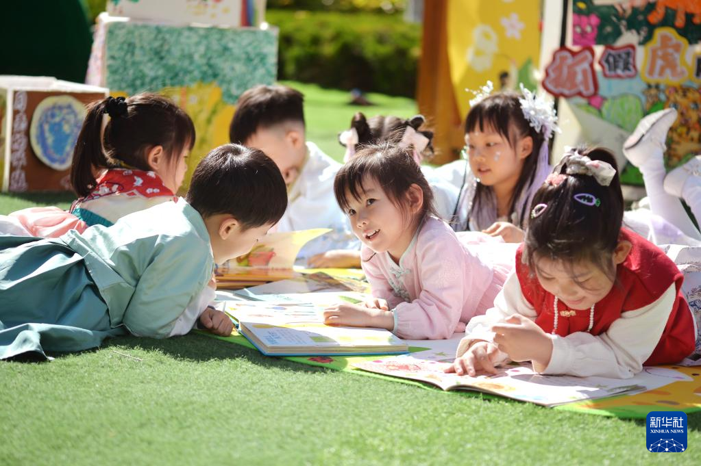 4月23日,在山东省青岛市市北区第二实验幼儿园举行的读书节活动上,小朋友们在春光中享受阅读的乐趣。