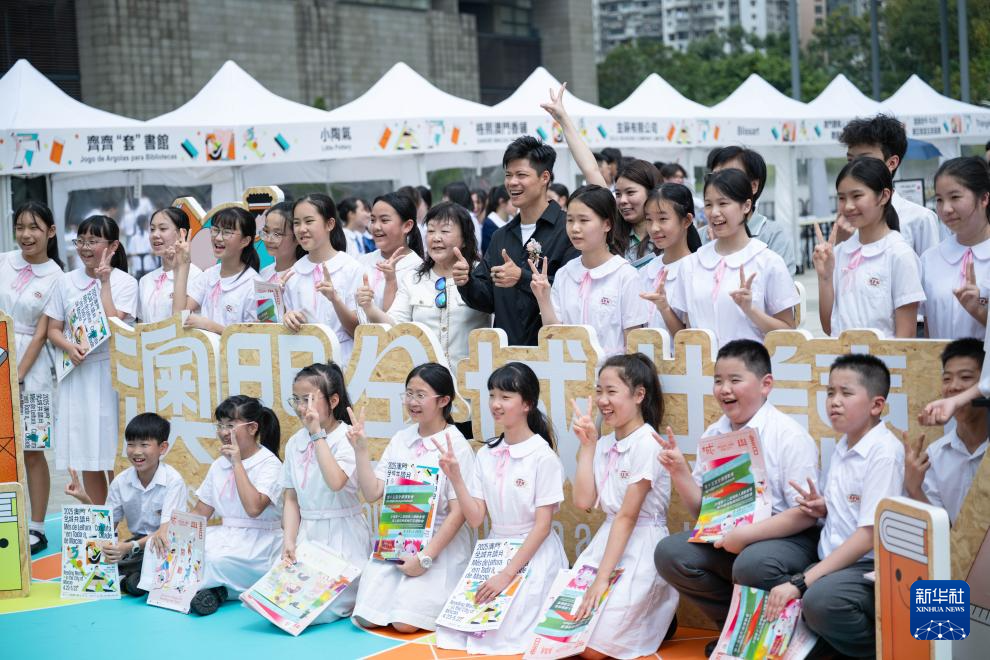 4月23日,“2025澳门全城共读月”在澳门文化中心广场举行启动仪式。田径运动员苏炳添在活动上与澳门学生合影。