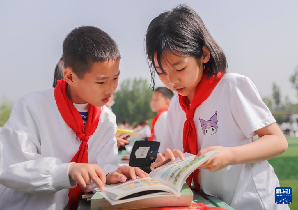 4月23日,在山东省枣庄市市中区文化路小学,两名学生在校园书吧里阅读时相互交流。