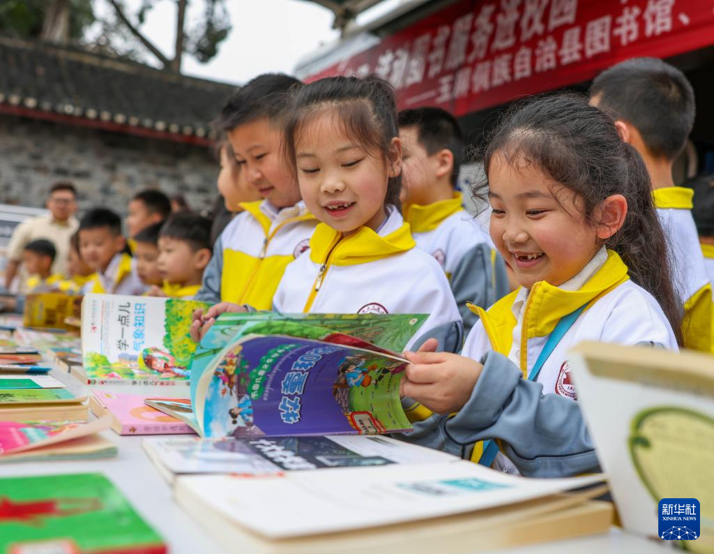 4月23日,在贵州省铜仁市玉屏侗族自治县印山民族小学,学生在流动图书车前阅读图书。
