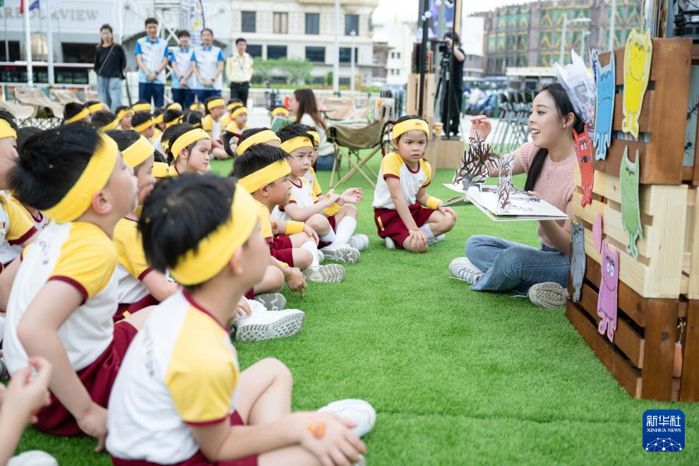 4月23日,澳门小朋友在户外阅读区听老师讲故事书。