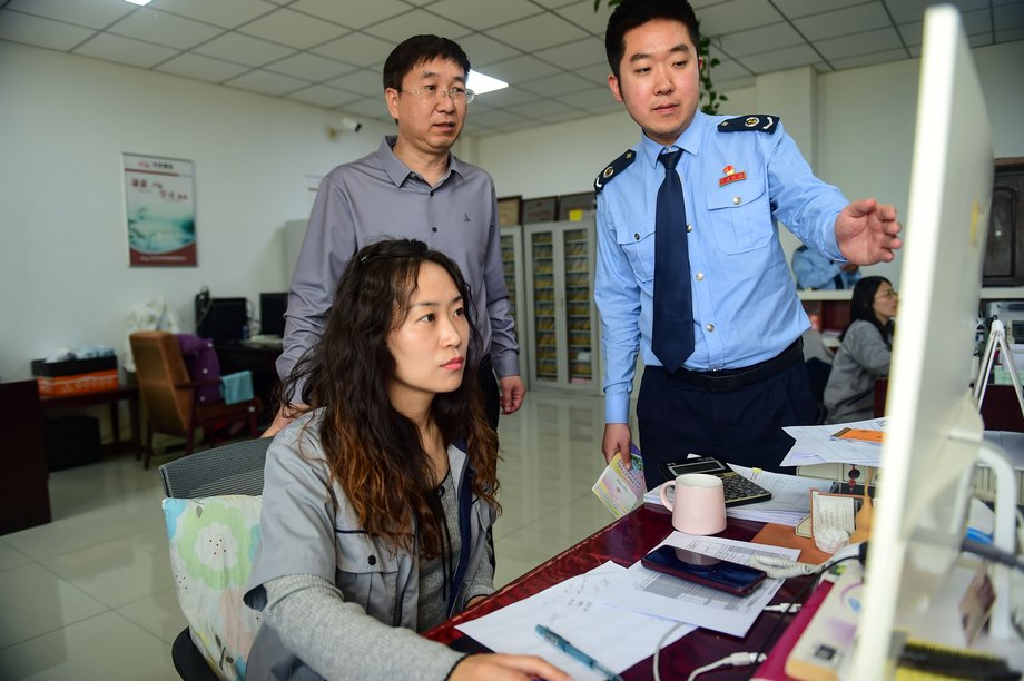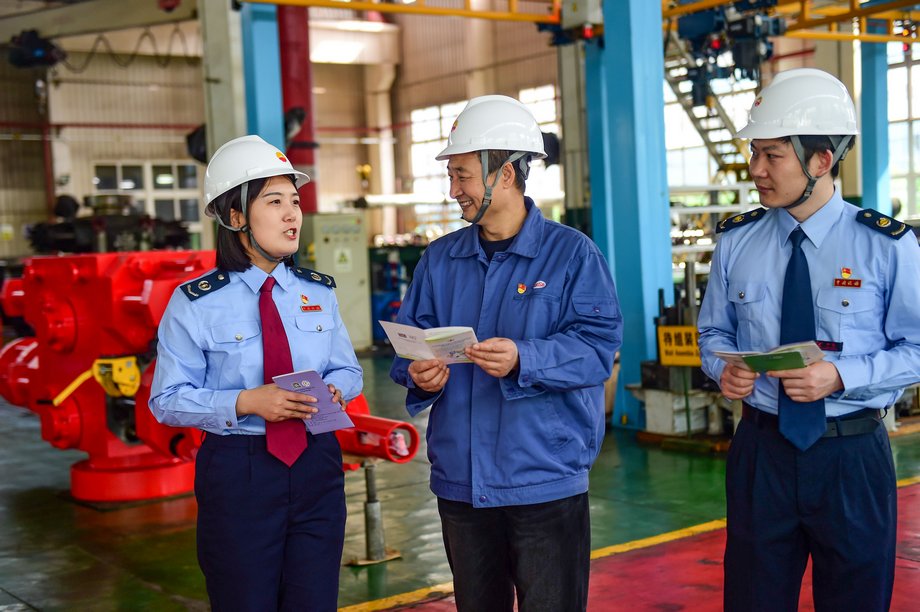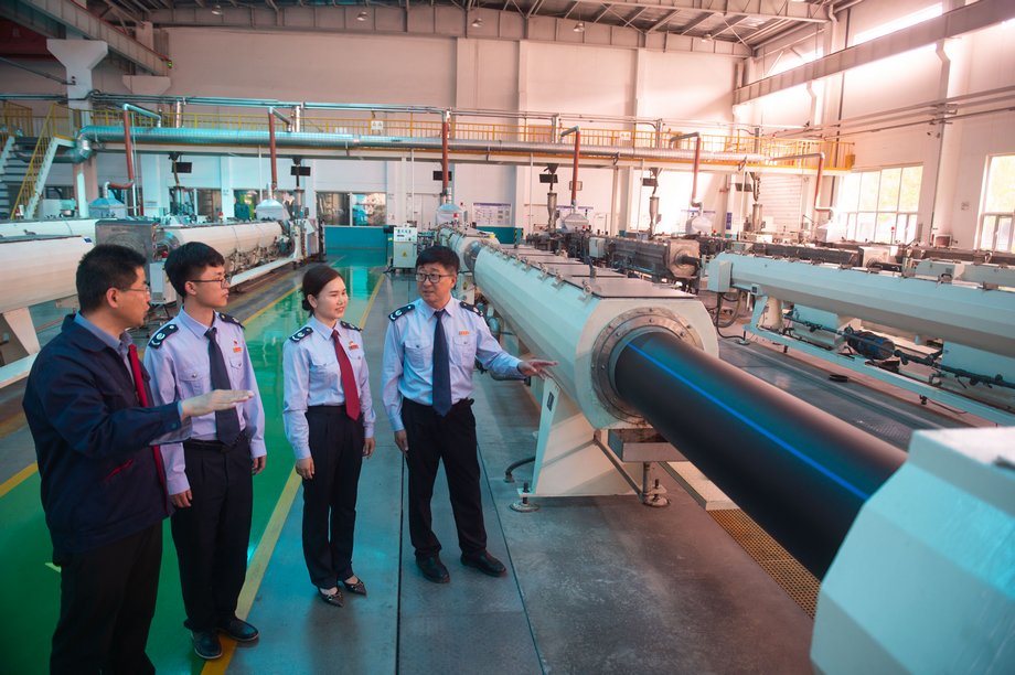 4月23日,在沧州高新区一家获评A级纳税信用的管道制造企业,税务工作人员了解企业纳税信用助推新产品开发情况。新华网发(任立新 摄)