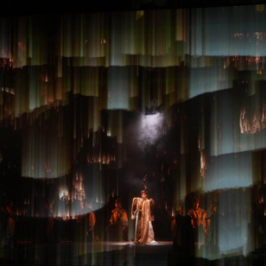 4月23日,演员在湖南大剧院演出新编京剧《皿方罍》,皿方罍的部分纹饰被投影在纱幕上。
