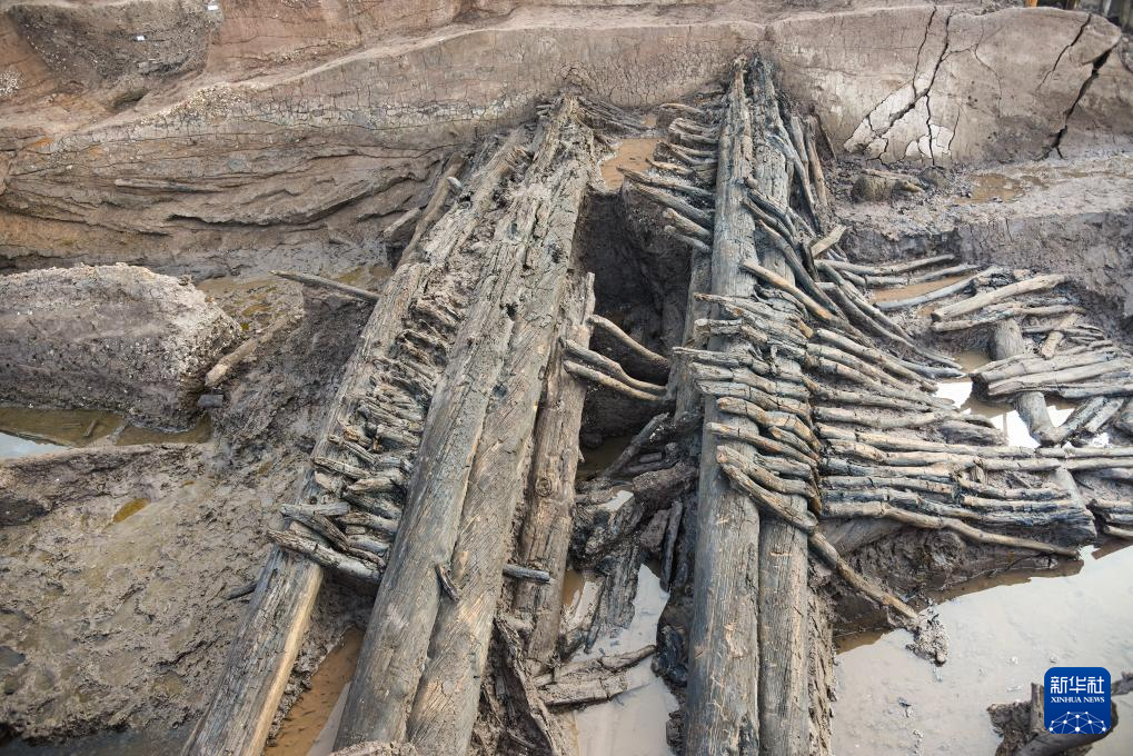 云南晋宁河泊所遗址出土的大型木构遗迹(资料照片)。