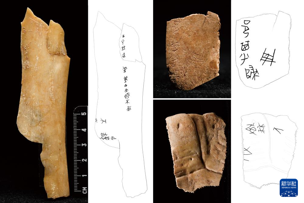 陕西宝鸡周原遗址出土的刻辞甲骨及摹本(拼版照片)。