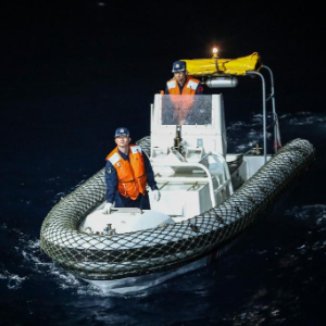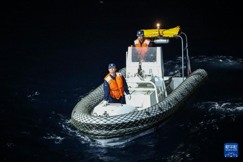 2月16日,在中国黄岩岛附近海域,高栏舰海警执法员开展夜间吊放执法艇训练。
