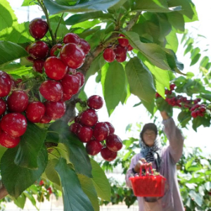 4月25日,河北省卢龙县蛤泊镇两县店村益民家庭农场的工人在大棚内采摘樱桃。