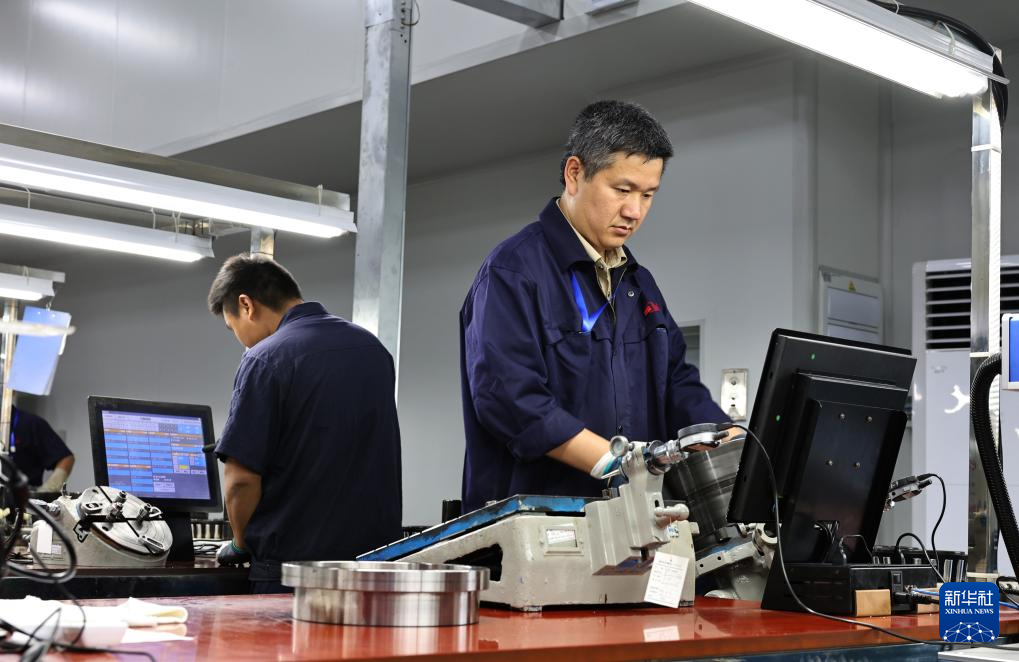 4月25日,工人在产线上熟悉新安装的数控机床操作技术。
