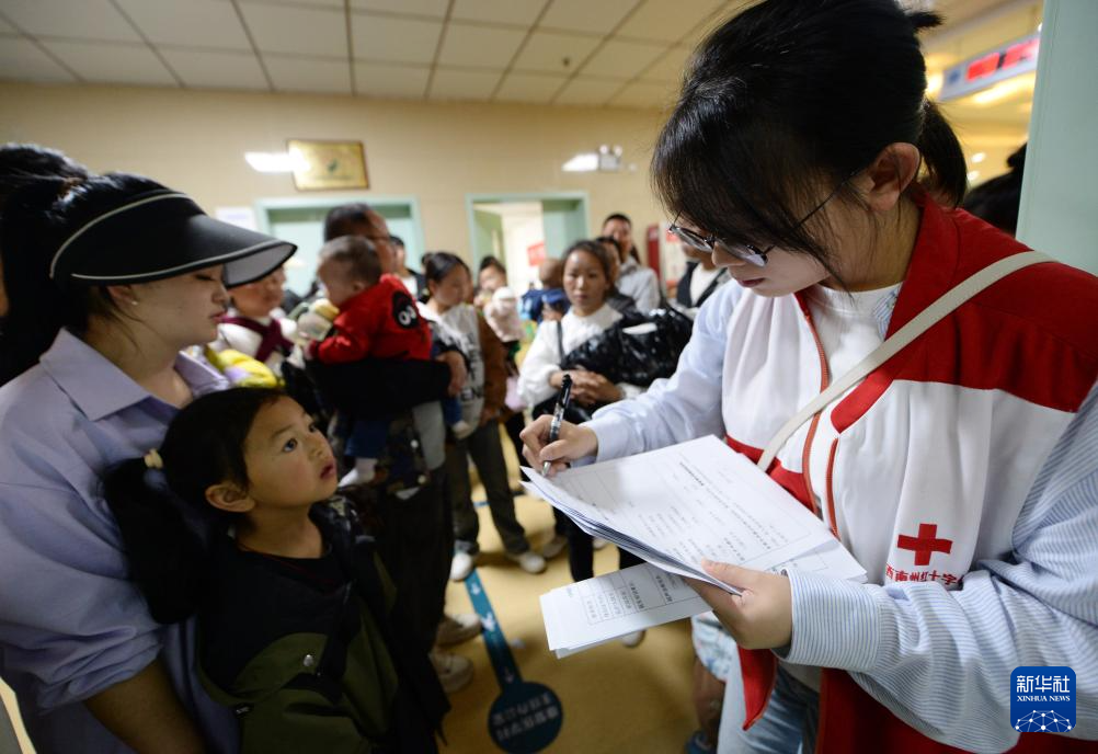 4月24日,在贵州黔西南布依族苗族自治州兴义西南医院,红十字志愿者在登记信息。