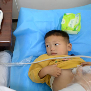 4月25日,在贵州册亨县人民医院,一名小朋友在接受检查。