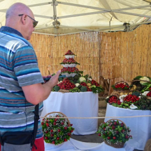 4月27日,在马耳他姆贾尔,游客观看用草莓和蔬菜搭建的装饰造型。