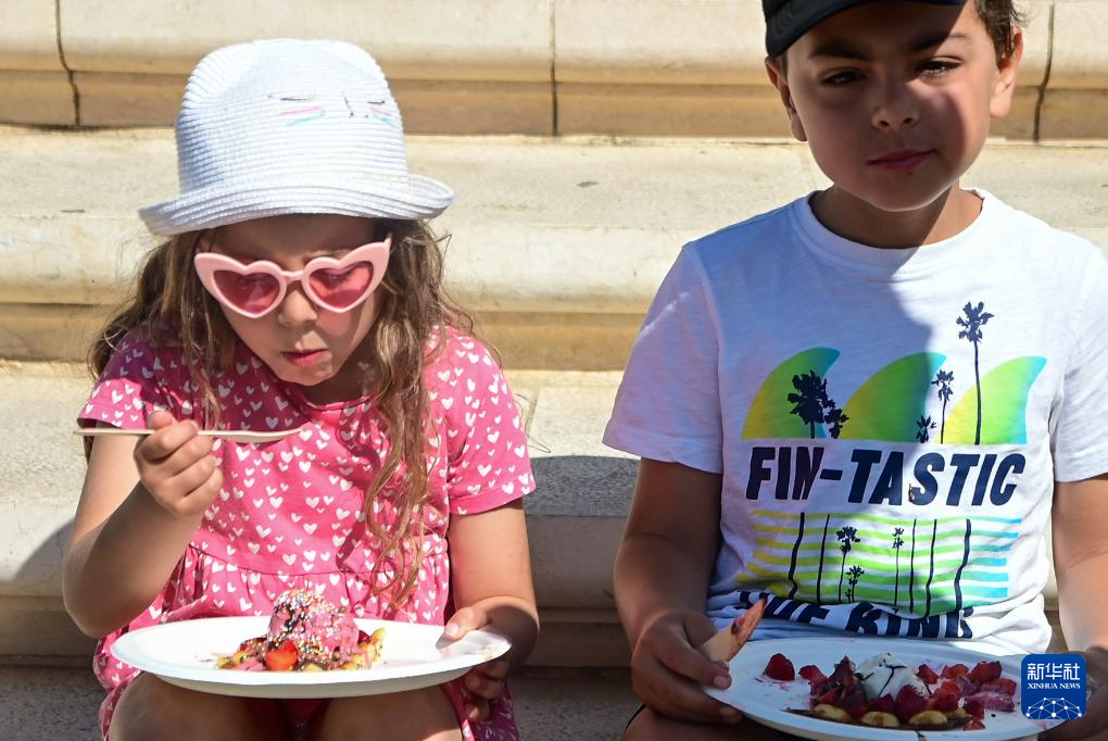 4月27日,在马耳他姆贾尔,两个孩子品尝用新鲜草莓制作的甜品。