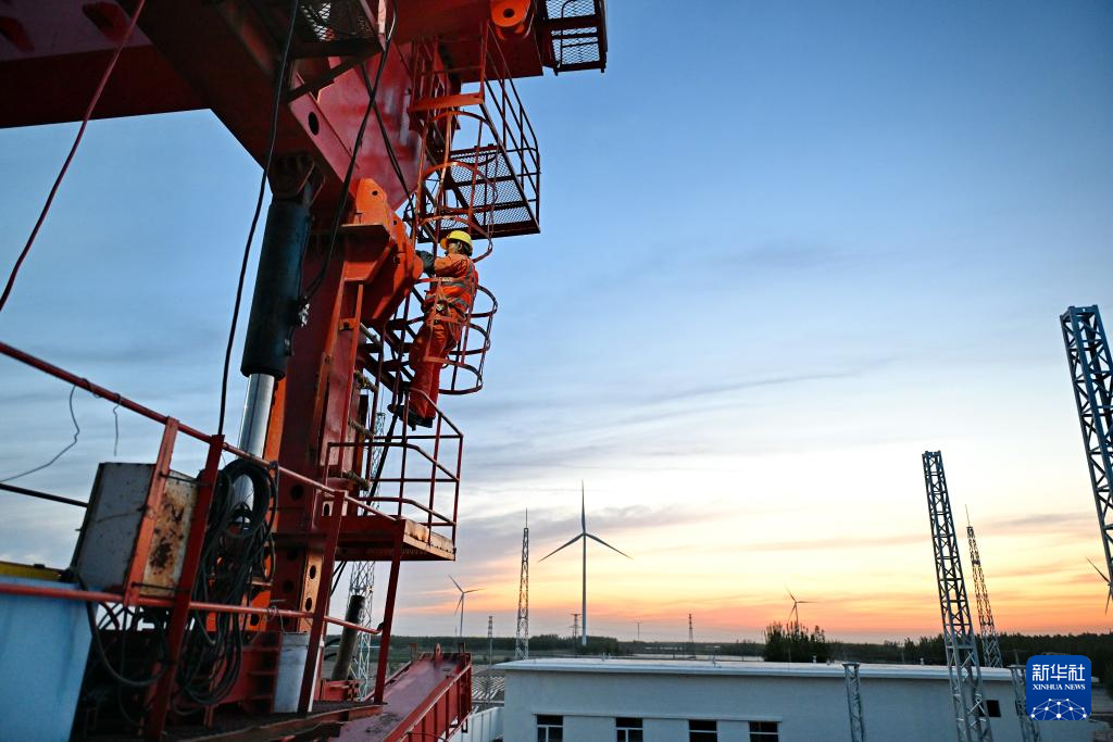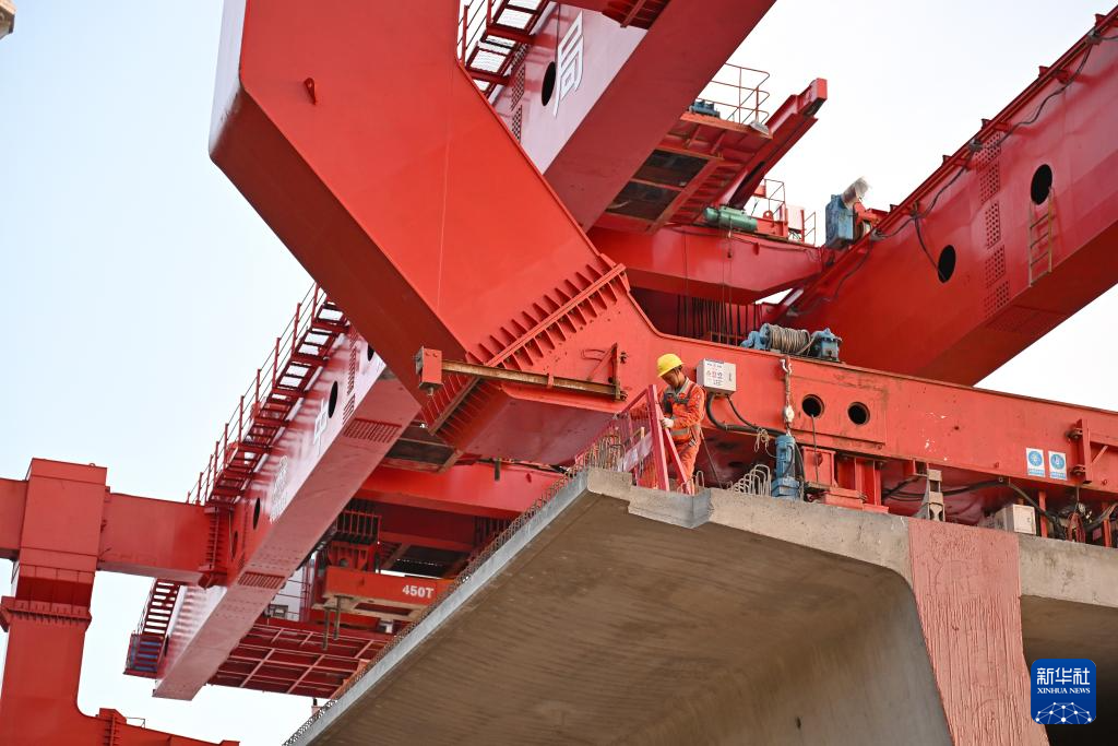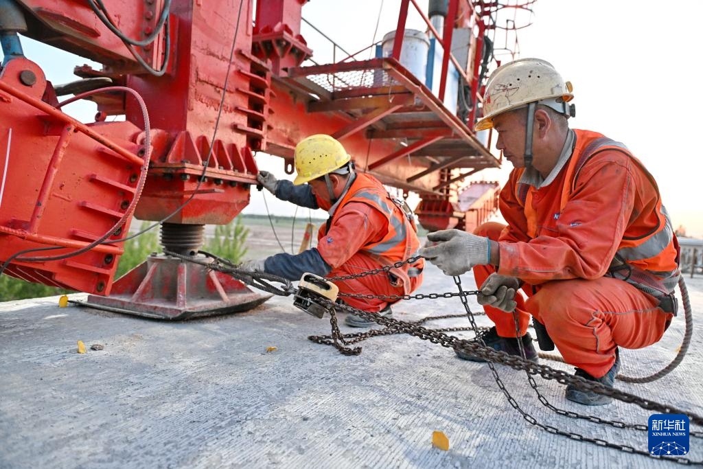 4月27日,中铁二十局集团工人在雄商高铁河北段最后一孔箱梁架设现场作业。