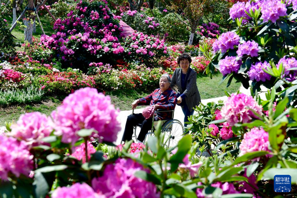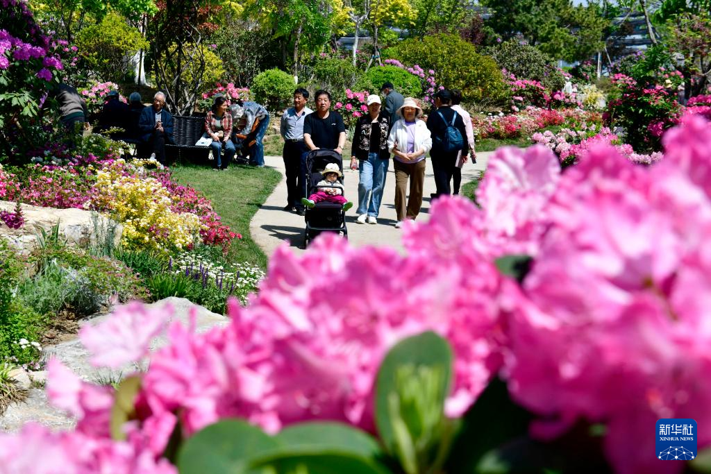 眼下,在山东日照山海天旅游度假区中国杜鹃花博览园,杜鹃花竞相开放,吸引了众多游客游园赏花。