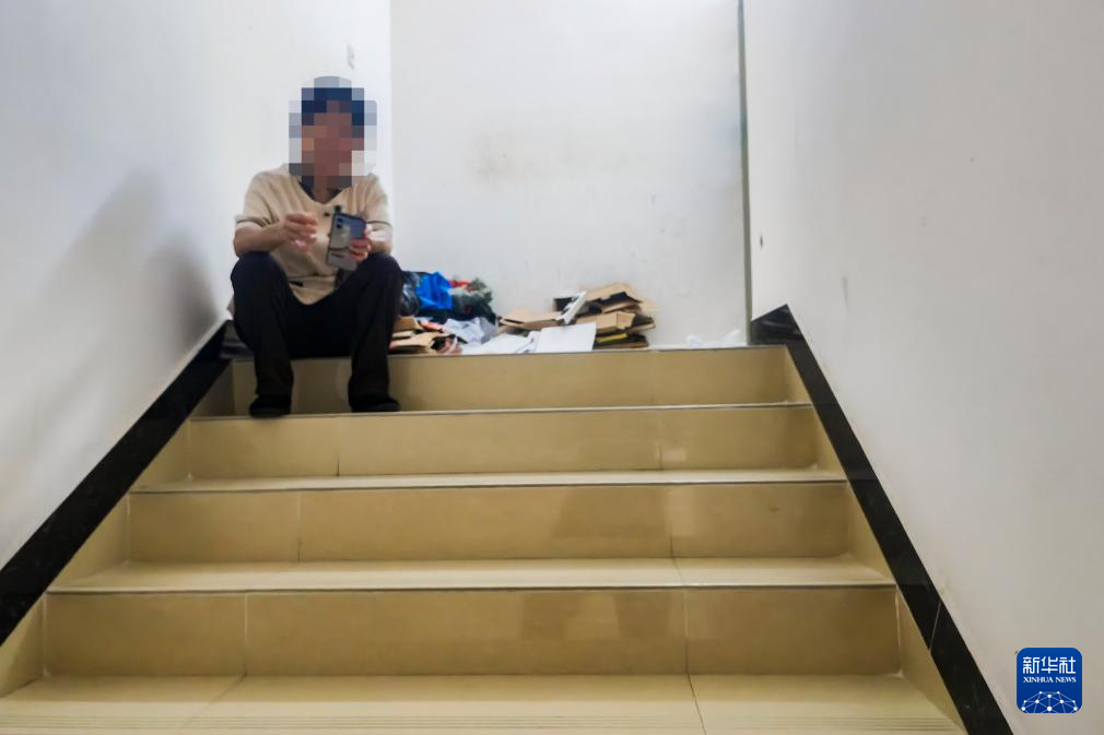 在广西某市一个商场,由于没有固定的休息室,保洁员只能在楼梯间里吃饭、休息(4月15日摄,拼版照片)。