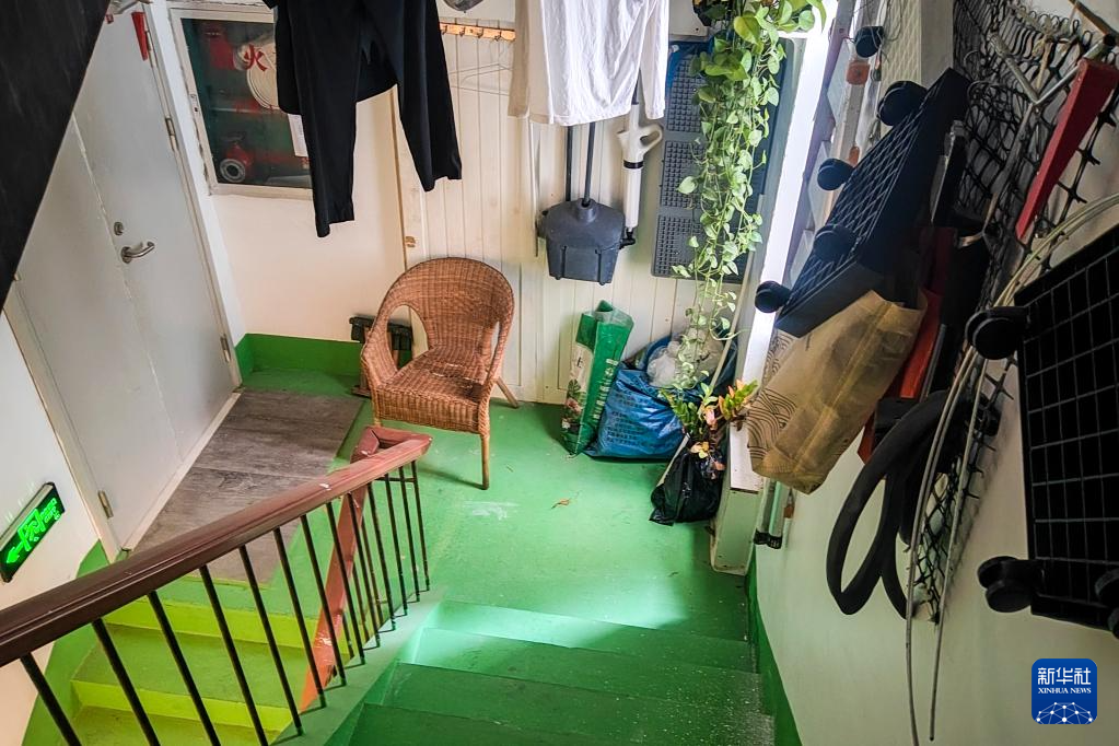 这是在广西某市一处写字楼的楼梯间拍摄的保洁员休息区(4月22日摄)。由于没有固定的保洁人员休息室,保洁人员只能在楼梯间里休息,把工具和个人衣物暂时放在此处。