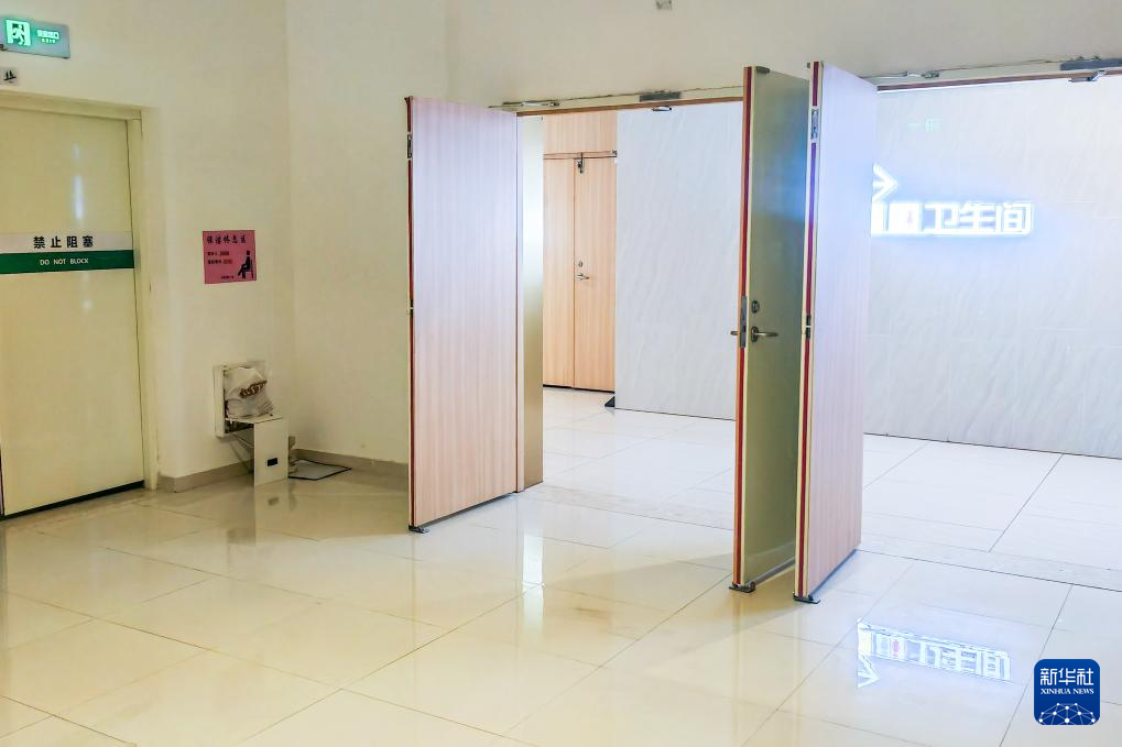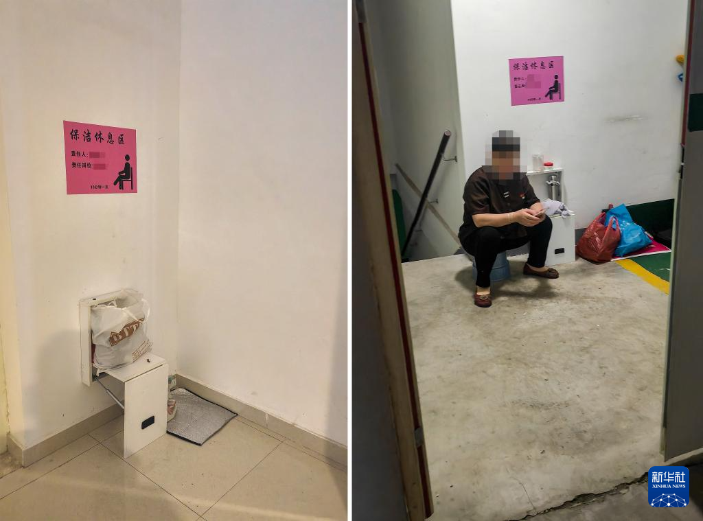 这是在广西某市一家商场拍摄的保洁员临时休息处(4月18日摄,拼版照片)。该商场除设有固定休息室外,还在距卫生间不远的地方安装折叠椅,供保洁人员临时休息。