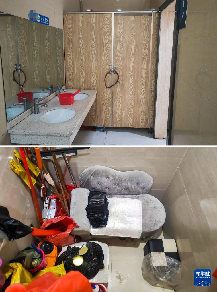 在广西某市一家商场内,卫生间里的一个小隔间既是保洁工具间,又是保洁人员休息室(4月17日摄,拼版照片)。