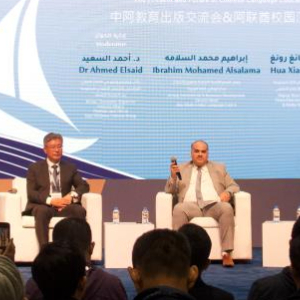4月27日,与会者参加在阿联酋阿布扎比国家展览中心举办的中阿教育出版交流会。
