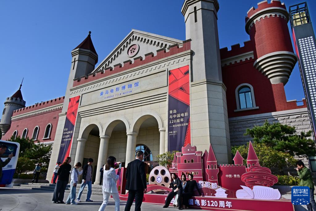 4月28日,观众在青岛电影博物馆外拍照留念。