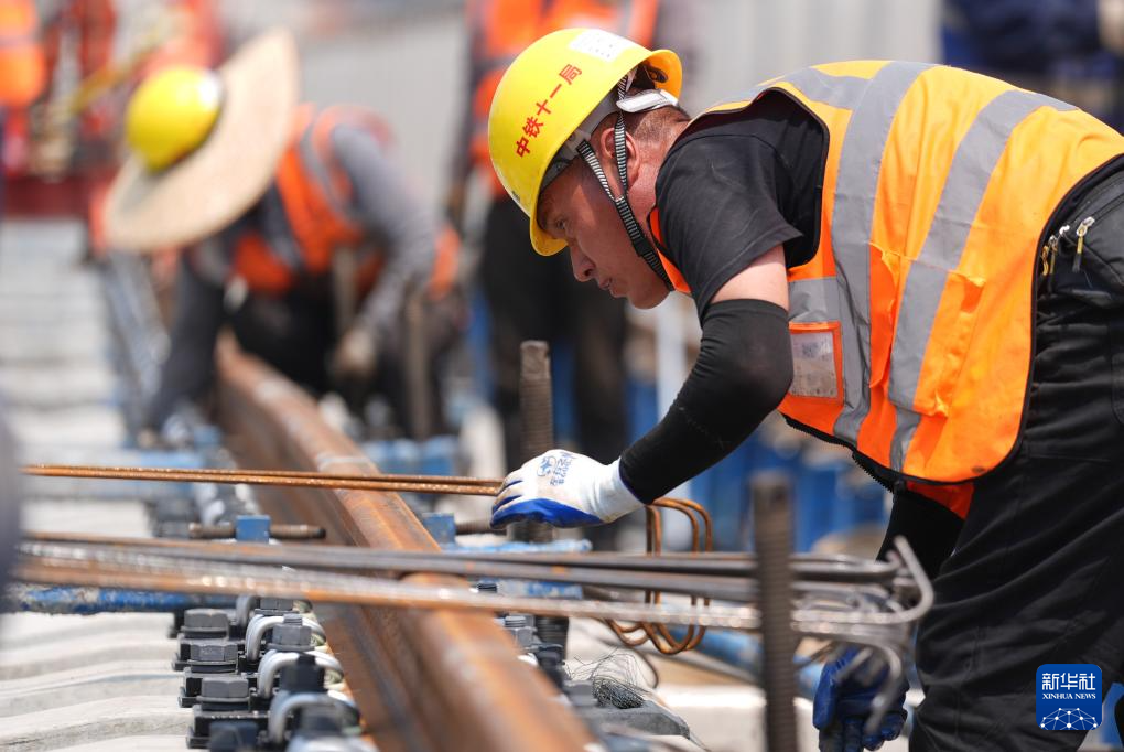 4月28日,中铁十一局建设者在杭州至德清市域铁路高架线铺轨现场作业。