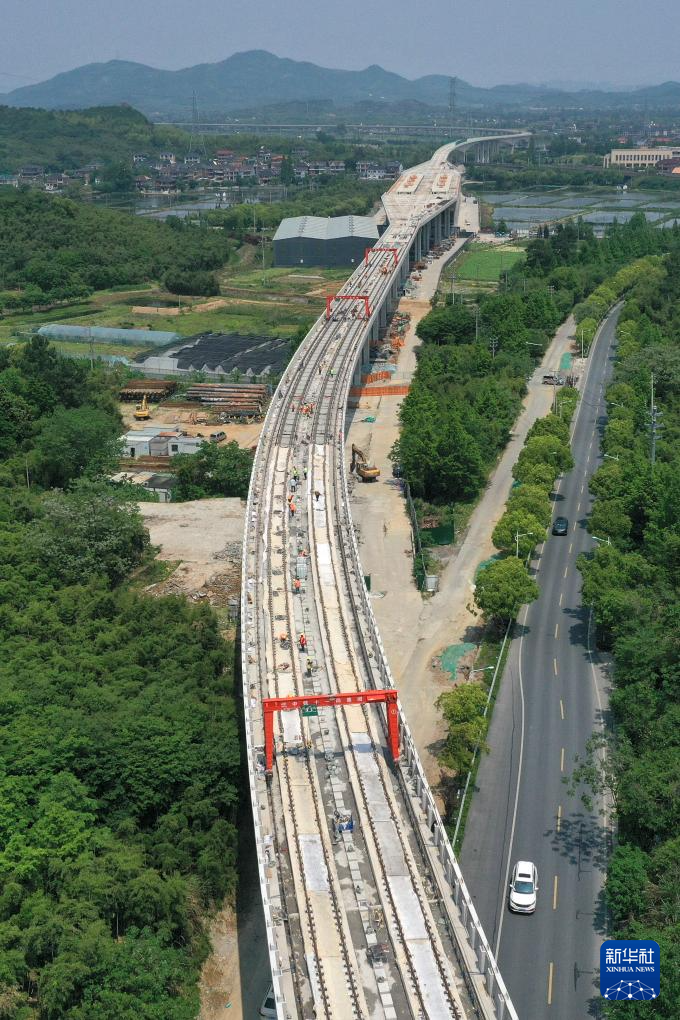 4月28日拍摄的杭州至德清市域铁路高架线铺轨现场(无人机照片)。