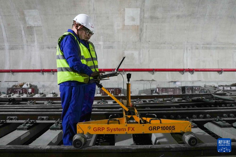 4月29日,中铁十四局测量人员在对京唐城际铁路无砟轨道进行施工精调。