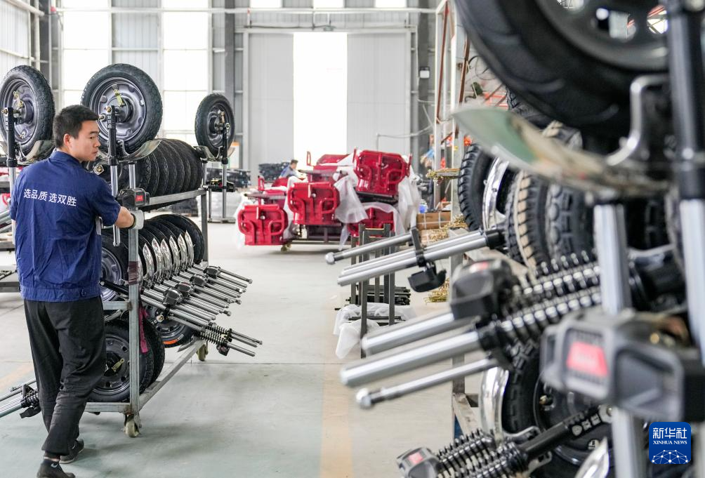 4月28日,在四川眉山天府新区视高工业园,工人在流水线上组装电动三轮车。
