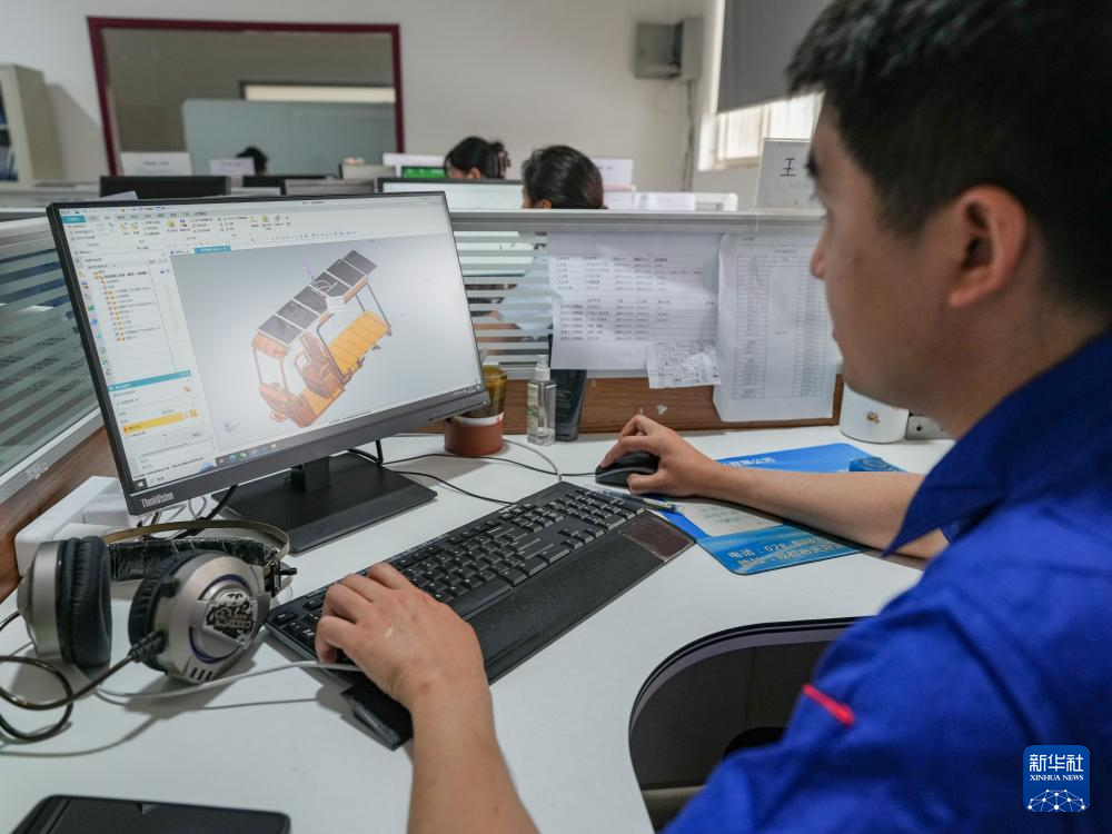 4月28日,在四川眉山天府新区视高工业园,研发人员在设计专供非洲市场的电动三轮车图纸。