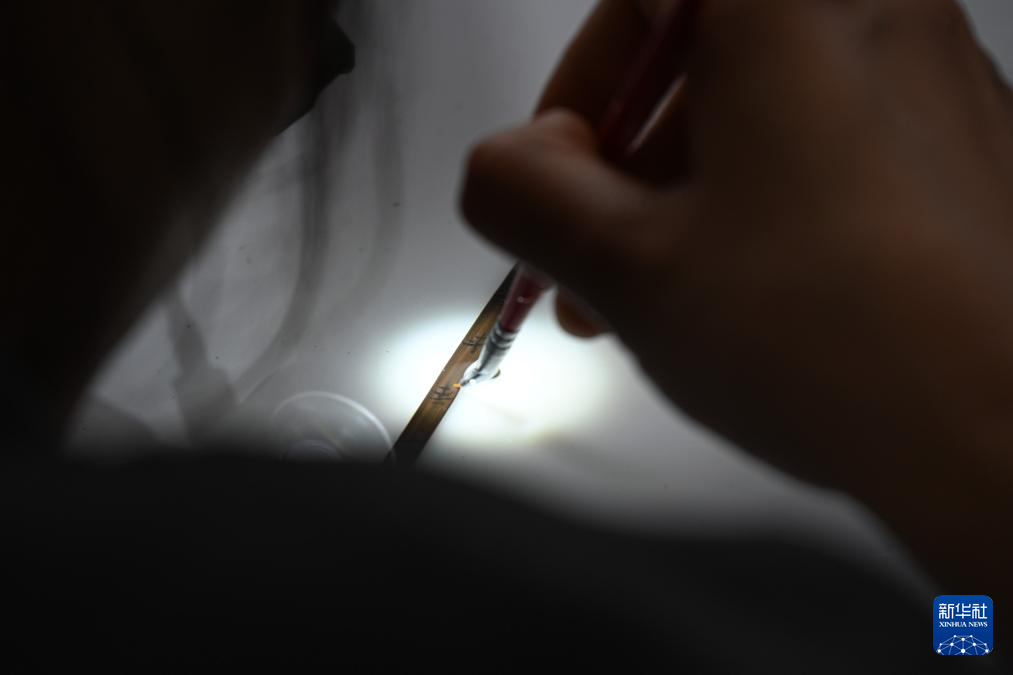 4月24日,主持“饱水简牍墨迹化学显影新技术研发与应用”项目的魏栋副教授(左)与工作人员检查扫描后的竹简文字。