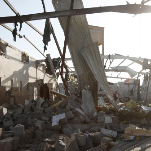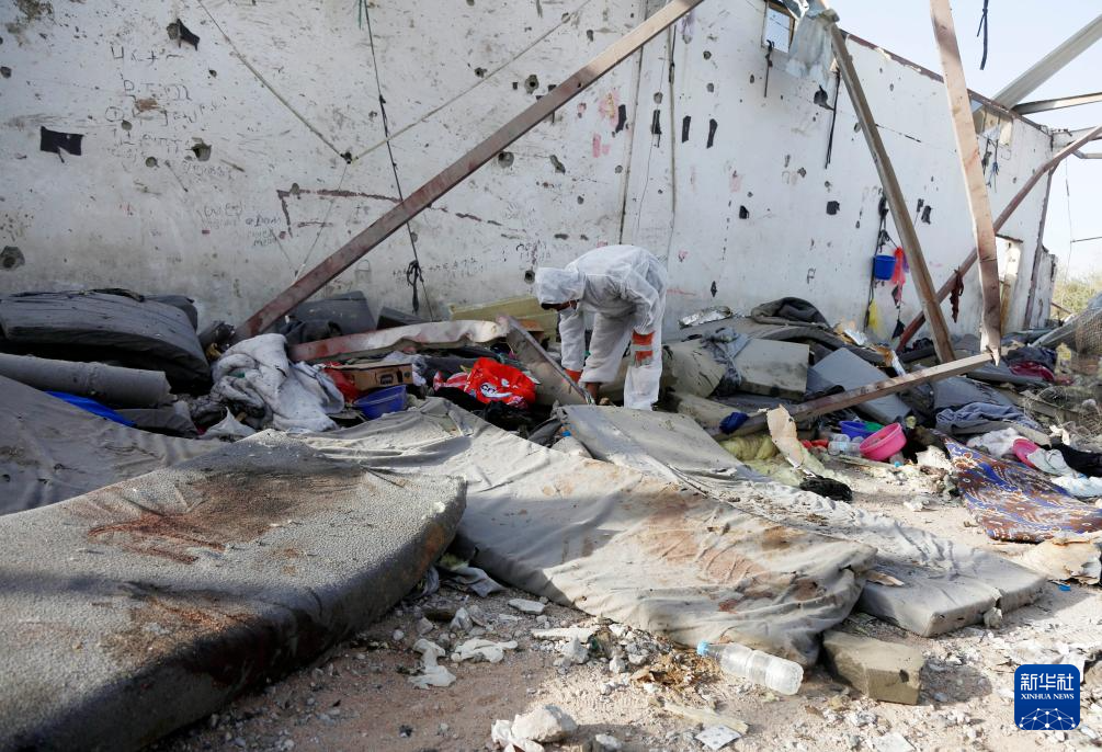 4月28日,在也门萨达省,一名调查人员在遭到空袭的拘留中心工作。