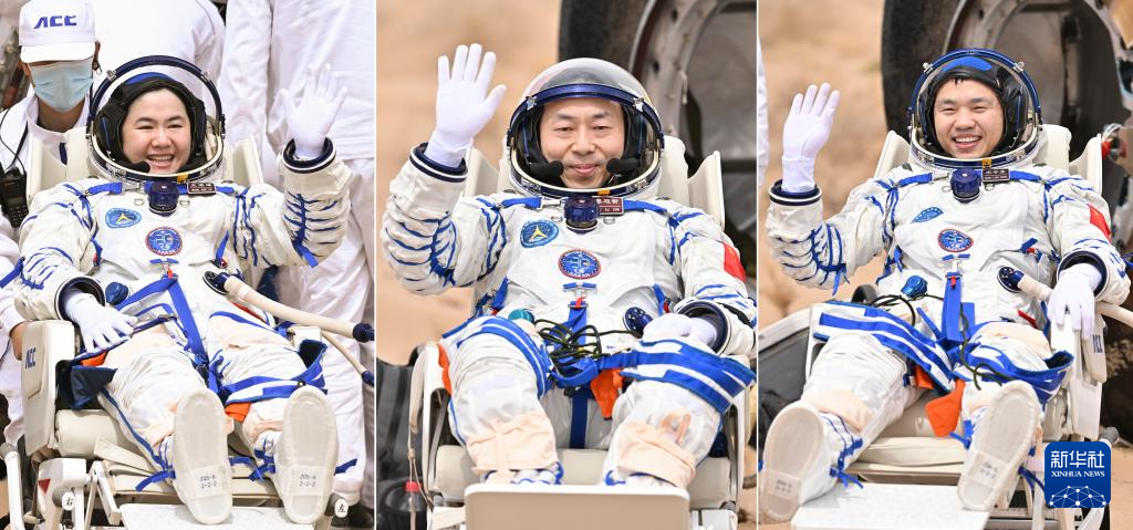 4月30日,神舟十九号航天员王浩泽、蔡旭哲、宋令东(从左至右)安全顺利出舱(拼版照片)。